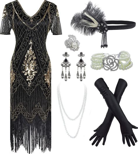 1920S Sequin Vintage Dress Beaded Gatsby Flapper Dress With Accessories Set