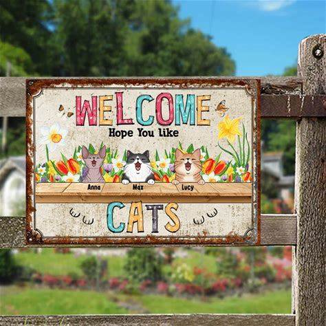 Metal Welcome Signs, Gifts For Cat Lovers, Welcome Hope You Like Cats Flower Personalized Home Signs