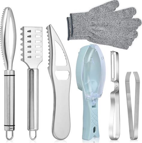 Worldity 7 Pieces Fish Scaler Brush Remover With Gray Mitten, Stainless Steel Sawtooth Remover Removing Peeler Cleaning Tool Fish Shape Tweezers For