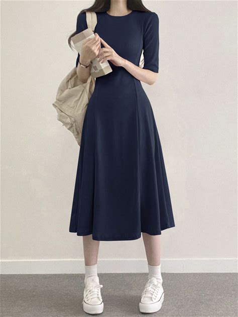 Solid Color Casual A-Line Dress With Round Neck Sundress,M