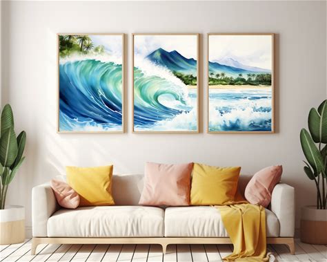 Maui Wave Hawaii Watercolor Print Set Of 3, Coastal Wall Art, Big Wave Surf Decor, Tropical Island Poster, Hawaiian Seaside Artwork