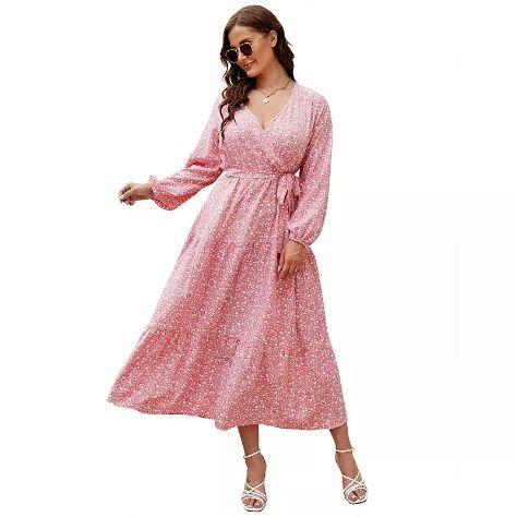 V Neck Maxi Wrap Dress For Plus Size Women Long Sleeves High Waist Ruffle Casual Belt Dress, Women's, Size: 3XL, Pink