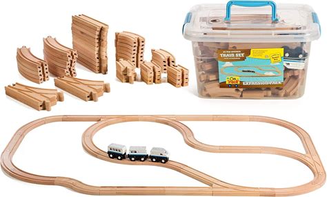 On Track USA Wooden Train Set 100 Piece Expansion Pack Train Track Set With Magnetic Engine Train Cars And Zoo Train, Compatible With All Major Brands, Comes In A Storage Container Pack Of 2