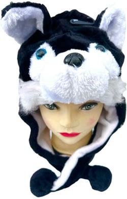 Plush Black Husky Animal Hat - Husky Hat With Ear Flaps And Poms