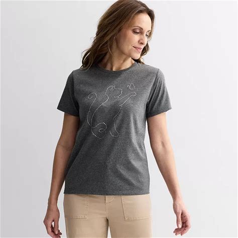 Women's MISSY Rhinestone Cat Short Sleeve Graphic Tee, Size: Large, Gray
