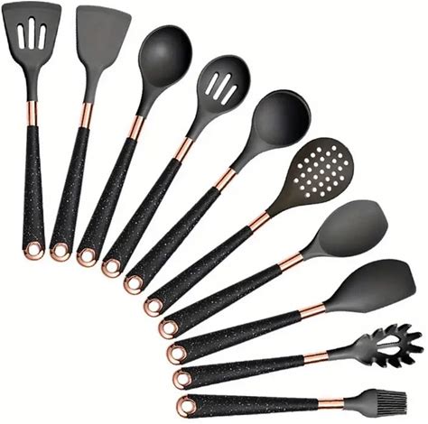 Gold Plated Silicone Cooking Utensil Set, Heat Resistant Kitchen Utensils, Nonstick Cookware | The Cutlery Collection, 10 Piece Set / Black