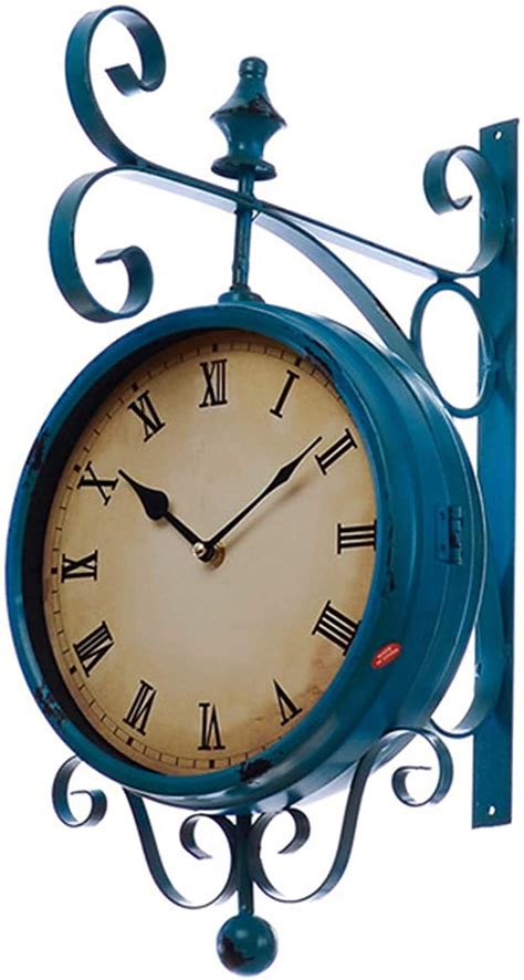 LIPJIA Wall Clock,Blue Double Sided Station Clock Outdoor Garden Clock Weatherproof Outdoor, 360 ° Rotation Wrought Iron Retro Decoration Outdoor